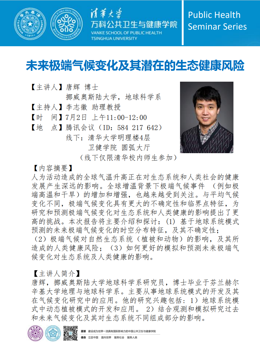 【清华公共卫生与健康系列讲座】唐辉:未来极端气候变化及其潜在的生态健康风险